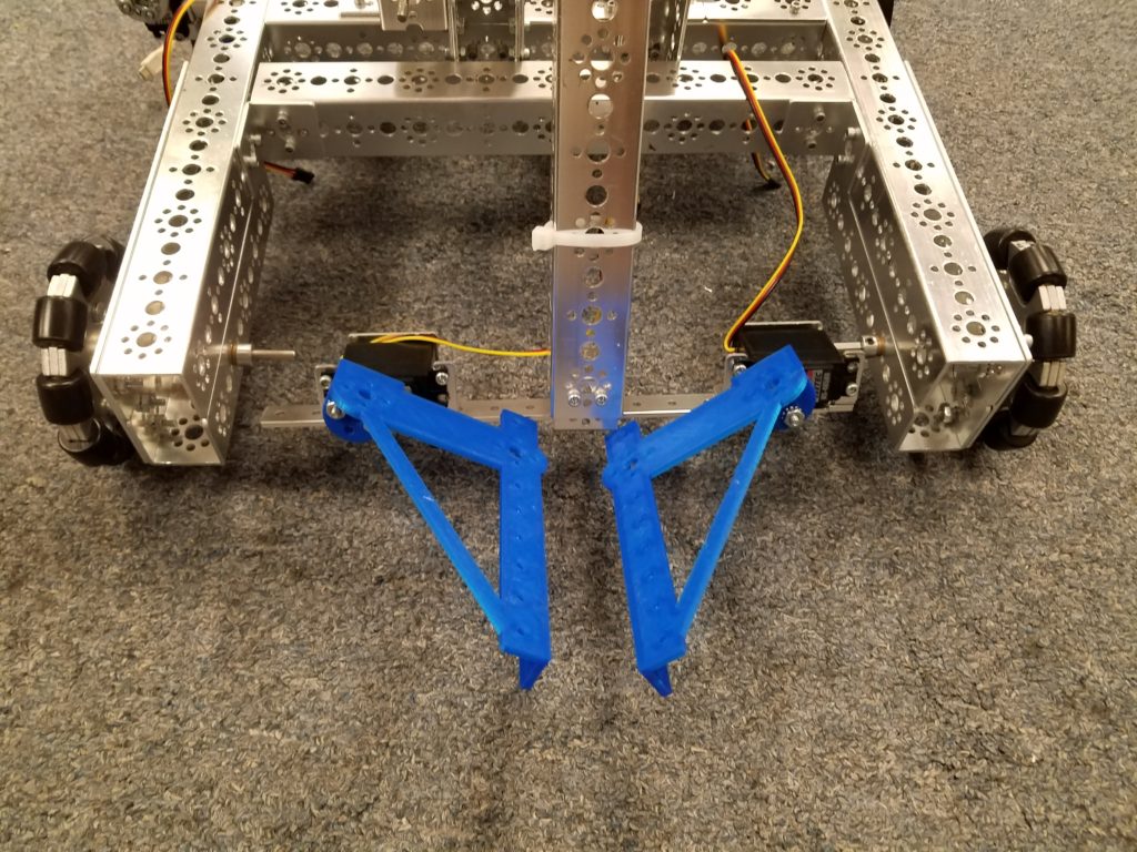 Pictured above is the first design for a glyph gripper we tried. It was based around one arm that could pivot from the front of the robot to the back. The idea was that we could drive to our glyphs, pick them up with the grippers, flip the arm to the back of the robot, and then drive straight backwards into the cryptobox. We decided that it would be much faster and more efficient than having to turn our entire robot around each time we wanted to score. We designed custom 3d printed grippers for the end of the arm to try and reduce the weight on our motors. The problem we ran into with this design was that it was very complicated to gear our motor appropriately to handle the load of the arm and glyphs. If we attached the motor directly to the arm, there wasn’t enough power to lift it, but if we used a complex gearing system, it was far too slow to fit our needs, and it ended up being much faster to turn the entire robot. This was a good experiment for us, and it ended up leading us to our next design, which you can read about below.