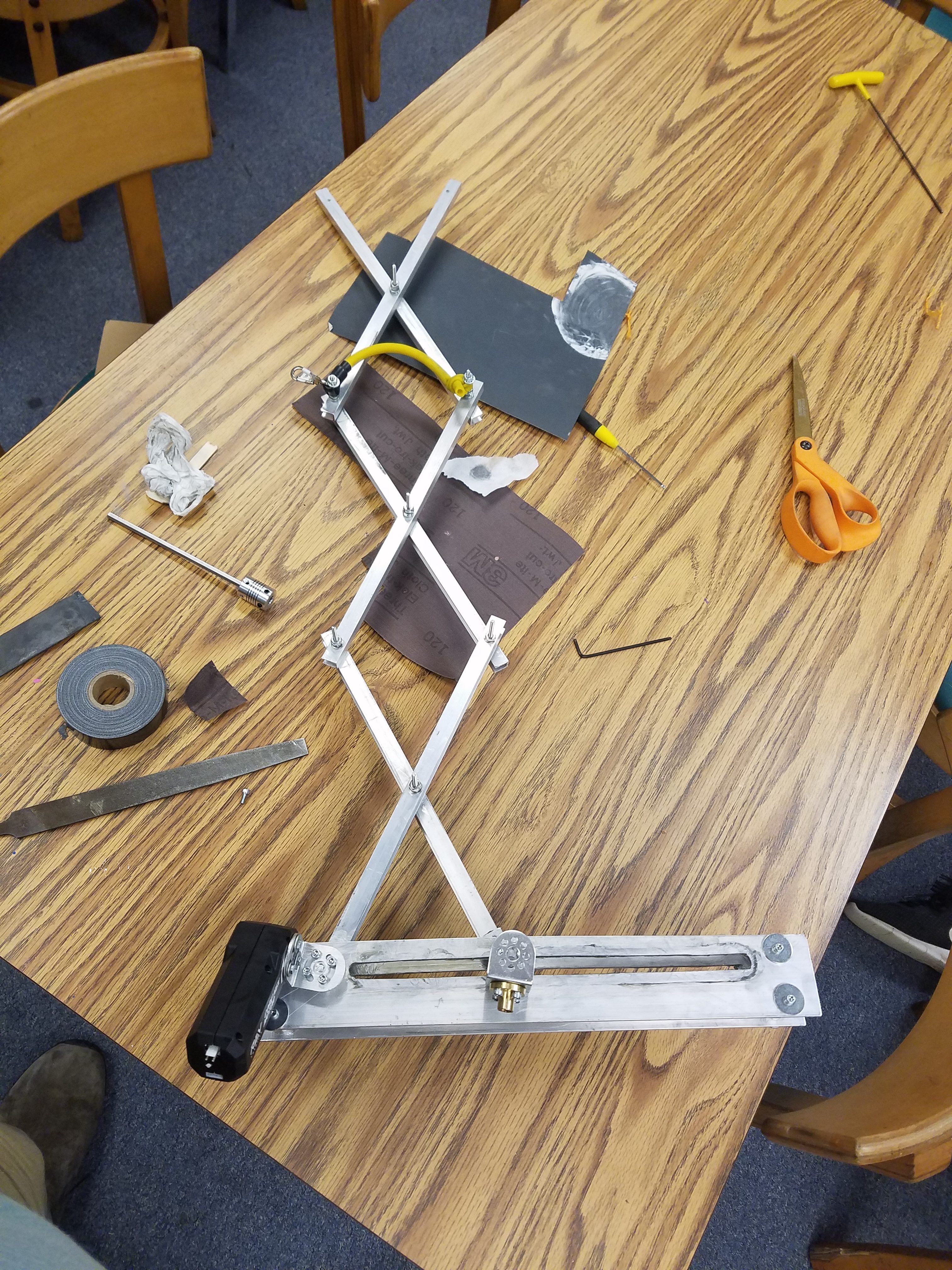 The largest single thing we can do to score points on the field is to score the relic standing up in the farthest zone. Knowing this, we spent a lot of time working on a mechanism to score those points reliably. The first design we tried was inspired by a scissor lift. The mechanism was almost identical, but the entire thing was rotated horizontally instead of vertically. We liked that we would be able to get a very long arm length from a compact mechanism. The fact that it could be driven by a single motor was also a plus. We had to dump this idea because the weight on the end of the arm caused it to bend in a way that was impossible to use.