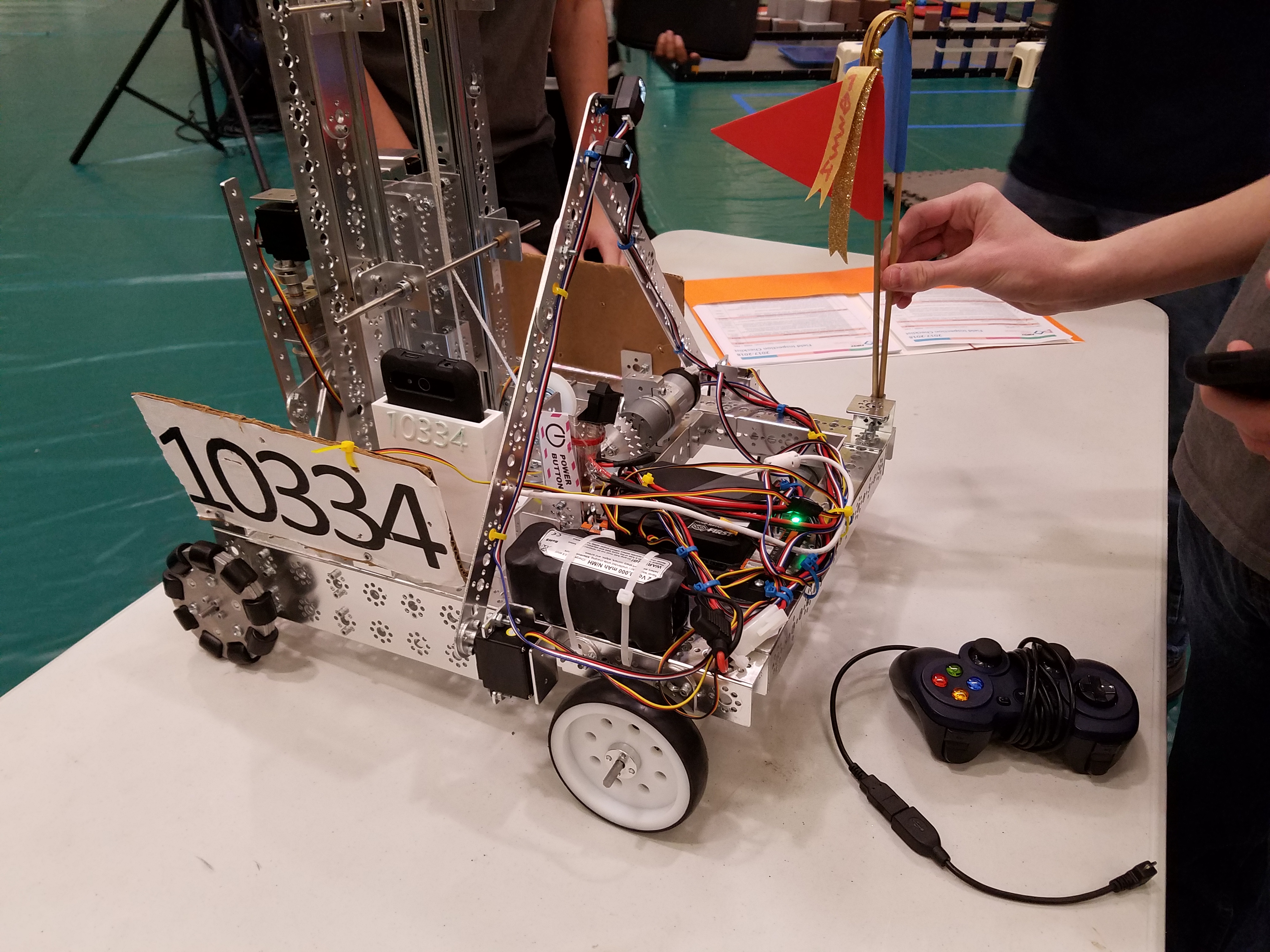Starting from the ground up, we begin with our chassis. This was designed to give us as much space as possible to attach other elements of our robot, while also giving us the ability to move our robot quickly and precisely. We decided to use a drivetrain consisting of four wheels and two motors. The wheels on the front of the robot are specially designed OmniWheels, which are able to move both forwards and sideways. This means we can make turns easily, almost as if we were using tank treads. The wheels on the back of the robot are standard wheels with weather stripping added for traction. We did this because we needed to be able to get on to the balancing stone with our heavy robot, and because adding traction to the rear wheels is much easier than adopting a four-wheel drive system. This drivetrain has been super reliable for us, but one thing we are planning on improving in the next season is the speed. While it is fine for most purposes, we found that it was a little bit too slow for doing fast trips across the field.